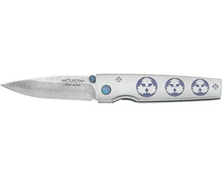 #Mcusta Kamon Damas Kaede Crest. Taille fermée 8,7 cm. Lame en acier Damas 33 niveaux de coeur VG10. poignée acier avec gravures.