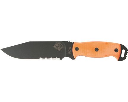 #Rangers couteaux RD 6 prêt détachement. taille totale : 29,8 cm. combo de type lame d'acier au carbone 5160 15,2 cm avec revêtement en poudre noir. Poignée micarta orange. Gaine de nylon noir.