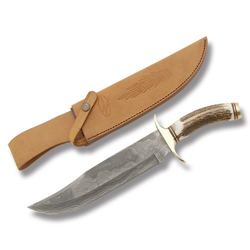 Fox-N-Hound Damascus Bowie.?Fox-N-Hound Bowie de Damas. Taille totale : 38 cm. lame de 24,7 cm en acier Damas. Cerf manipuler avec garde de laiton et d'arçon. Fourreau en cuir brun.