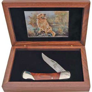 Bear & Son Golden Retriever Se?Ours & fils la faune Golden Retriever. De 12,7 cm fermé. lame gravée par l'image et la signature de l'artiste. Manche en bois. Pack d'exposition en bois dans un dessin.