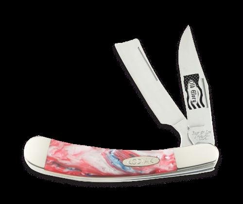 #Fils rasoir série Kodiak Old Glory. Taille : 10.16 cm fermé. Lame de Type de mesure: 2 lames plates. MATÉRIAU de la lame : en acier inoxydable 440. MATÉRIEL de poignée : Mica perle rouge, bleu et blanc. Poids : 113 g