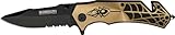 | ✚✚✚ Misc Speed Assisted Spider Misc couteau vitesse assistée Spider. Mesure 12 pouces lorsque fermé. lame de 8.65 cm a partiellement dentelée en acier avec revêtement noir. Or anodisé poignée en aluminium avec dessin d'araignée. Intégré disjoncteur garniture sangle et le verre.